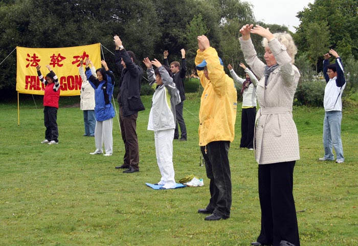 看到眼前这些法轮功学员们伴随着优美的炼功音乐在草坪上向人们展示舒缓、祥和的五套功法,再看看真相展板上那些揭露迫害的惨不忍睹的图片,一对叫 Malou和Jern的瑞典中年夫妇很不解的上前询问:“这(迫害)难道是真的吗?”当得到肯定的答案时,他们很震惊。