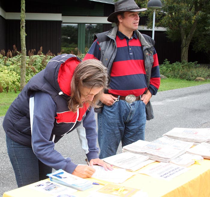 西人法轮功学员Torbjorn一听,知道他们是将中国和中共这两个概念混淆了。于是Torbjorn就将“中共不等于中国”、中共迫害法轮功以及活摘法轮功学员器官的暴行详细的讲给了他们。妻子Malou听了迫害真相很是惊讶,非常的气愤,马上走到桌子旁在签名簿上签名,谴责中共用如此残忍的手段迫害这些善良的法轮功学员。她签了自己的名字后,转身又将笔递给了自己的丈夫,催促正在和学员交谈的丈夫也来签个名。