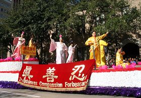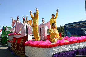![]() 法轮功学员在精美花车上演示功法 |