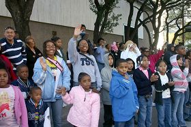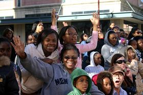 身着亮丽汉服天国乐团是首次在马丁路德金大游行亮相,他们神采奕奕,演奏独特,格外醒目;随后是精美的花车,身着黄色炼功服的法轮功学员在上面演示法轮功功法,舒缓的音乐与炼功动作,吸引了观众的目光,并赢得观众喝彩:“棒极了(Wonderful), 太美了(Beautiful)。”一路上观众中不断传出叫好声,并有观众模仿炼功动作,还有的拿着录影机和照像机抢拍这美好的镜头。