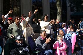 ![]() 法轮功队伍经过时,沿途观众不断发出叫好声:“棒极了(Wonderful), 太美了(Beautiful)。” |