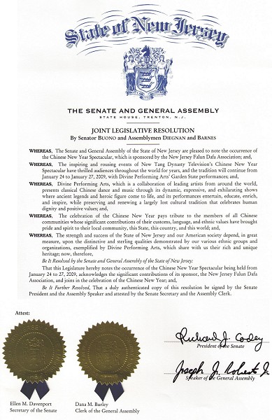 另外,新州参议员布诺(Barbara Buono)、州众议员迪格南(Patrick Diegnan)和巴内斯(Peter Barnes)联合发起的州参众两院同时颁发决议表彰神韵艺术团和主办单位的贡献。州参议院主席寇迪和州众议院议长罗伯茨联合签署了该联合决议。