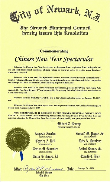 ![]() 纽瓦克市议会决议表彰神韵艺术团的演出 |
