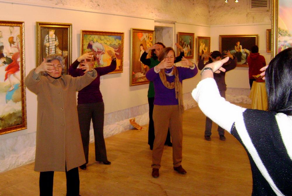 ![]() 观众们在展厅里学习法轮功功法 |