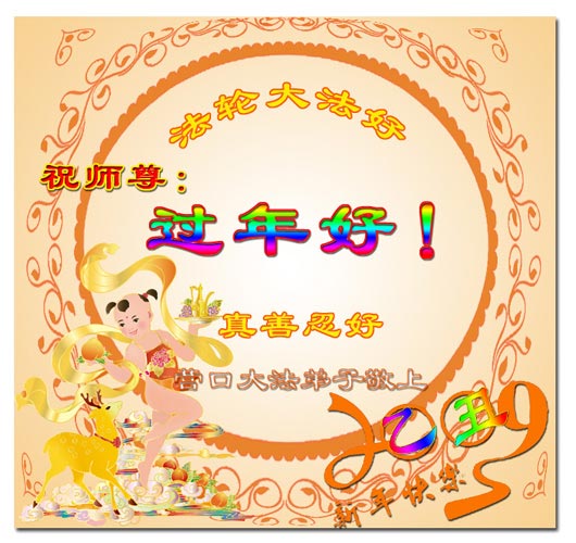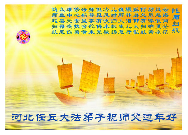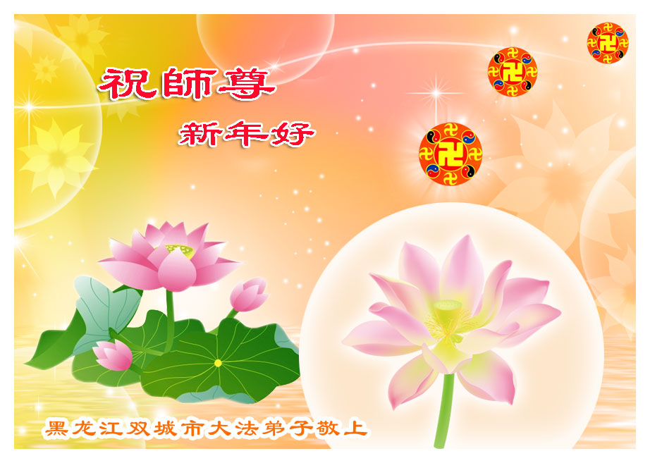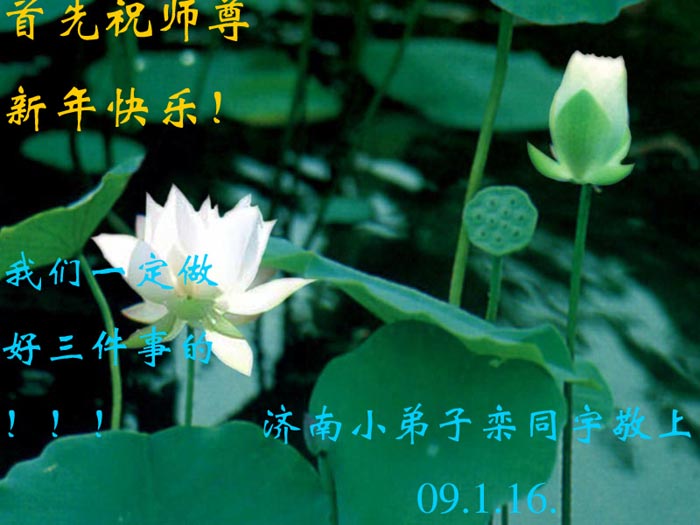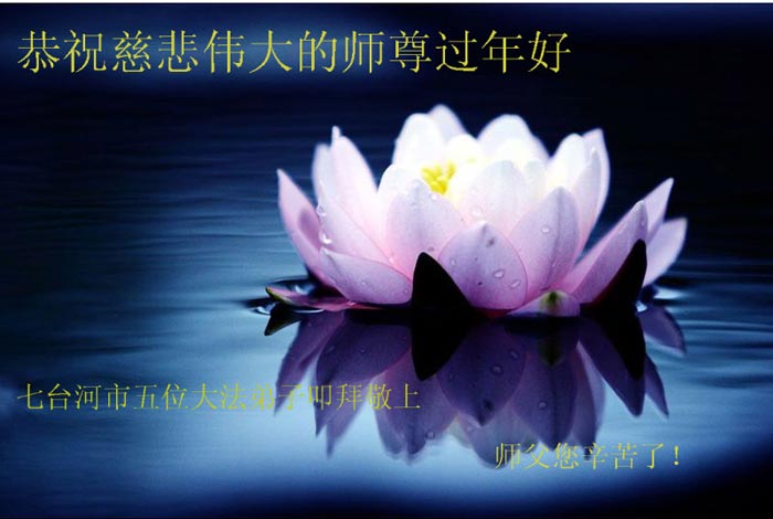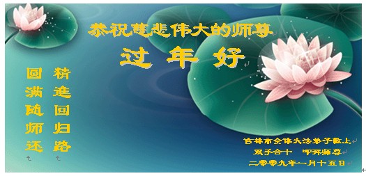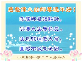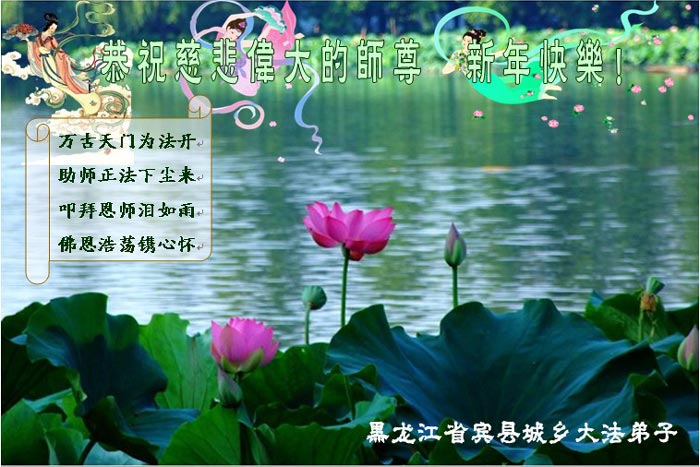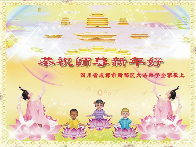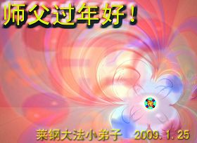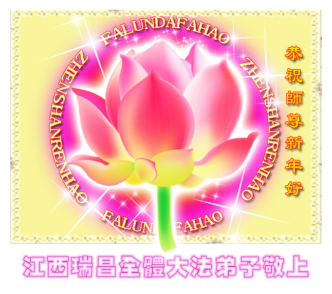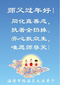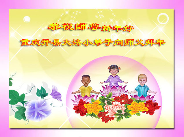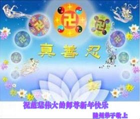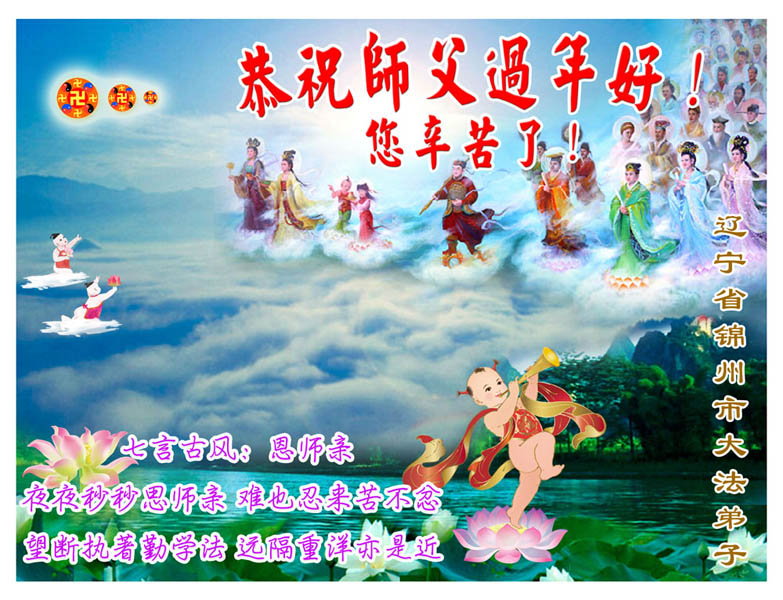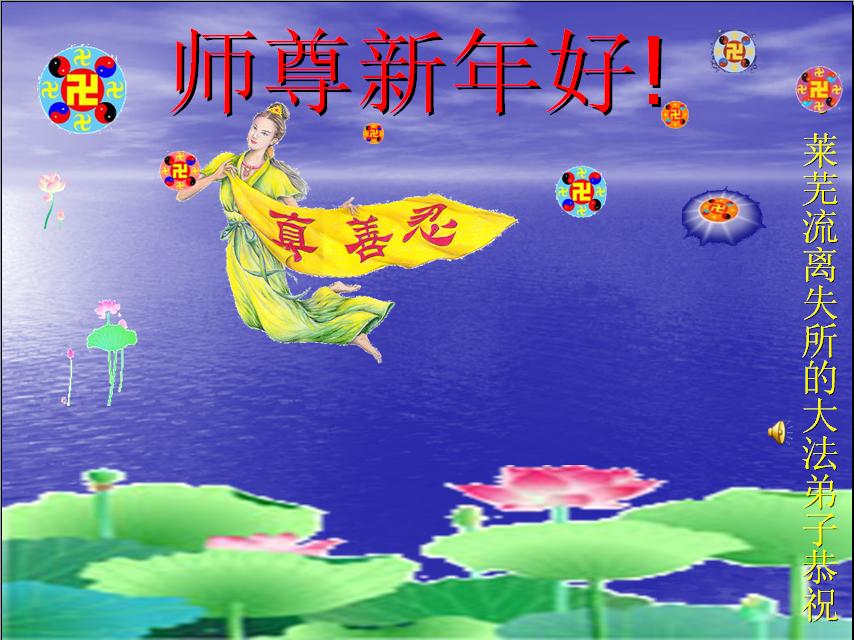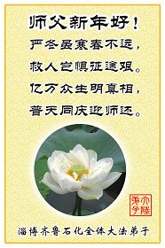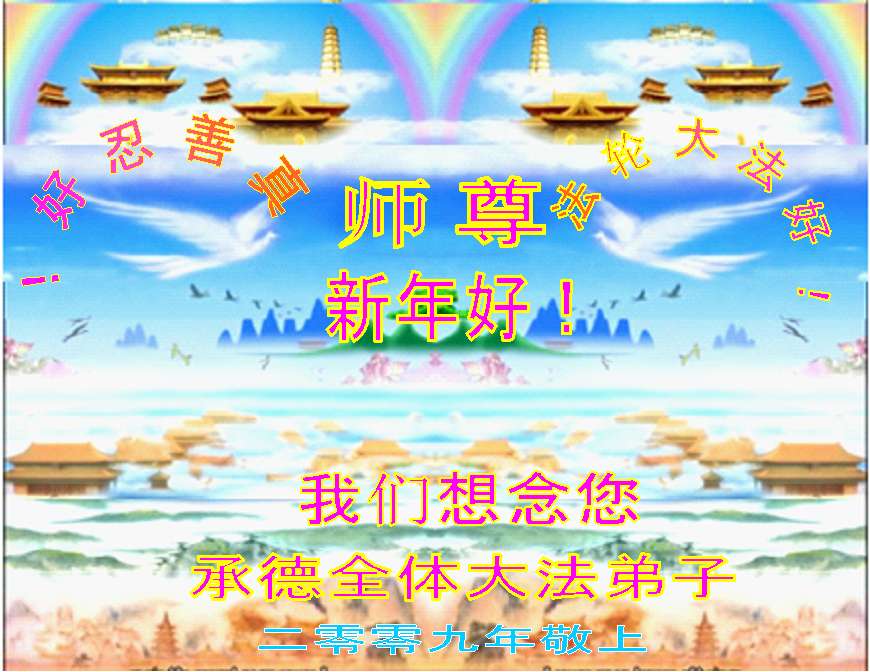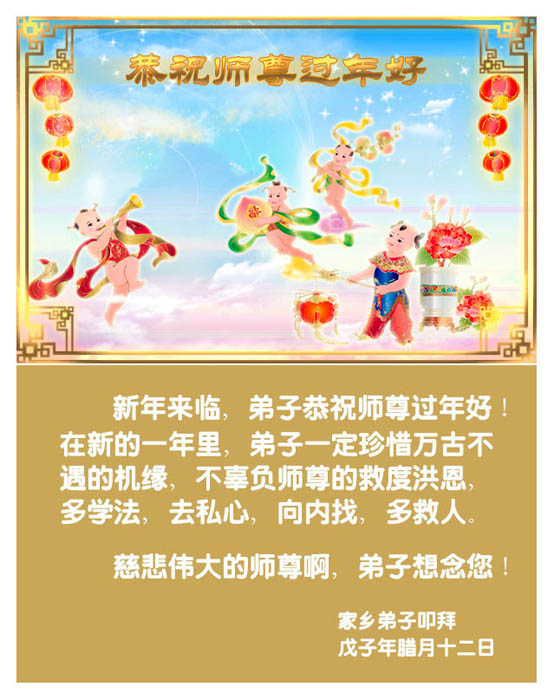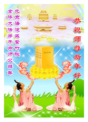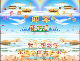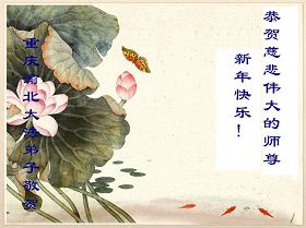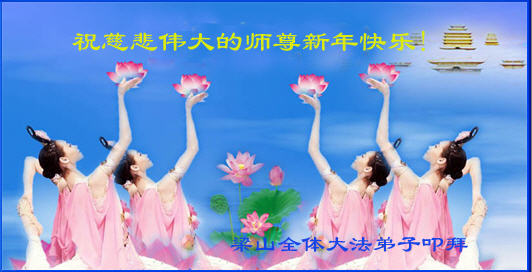 在中国新年到来之时,我们怀着无比崇敬至尊至高的心情衷心祝福师父中国新年快乐!弟子们想念师父,多想与师父同在,返本归真,回到我们真正的家园。为此只有加倍努力做好三件事,无条件的向内找,修去为私为我的旧宇宙观念,去掉最后根本的执着。讲清真相、救度众生,正念正行,完成正法时期大法弟子的伟大使命!