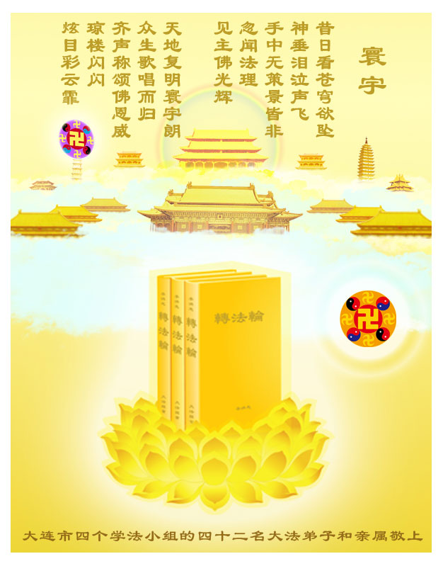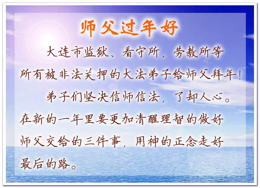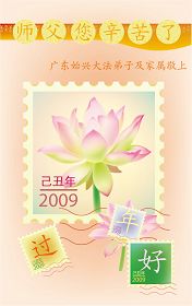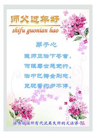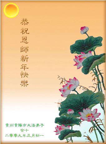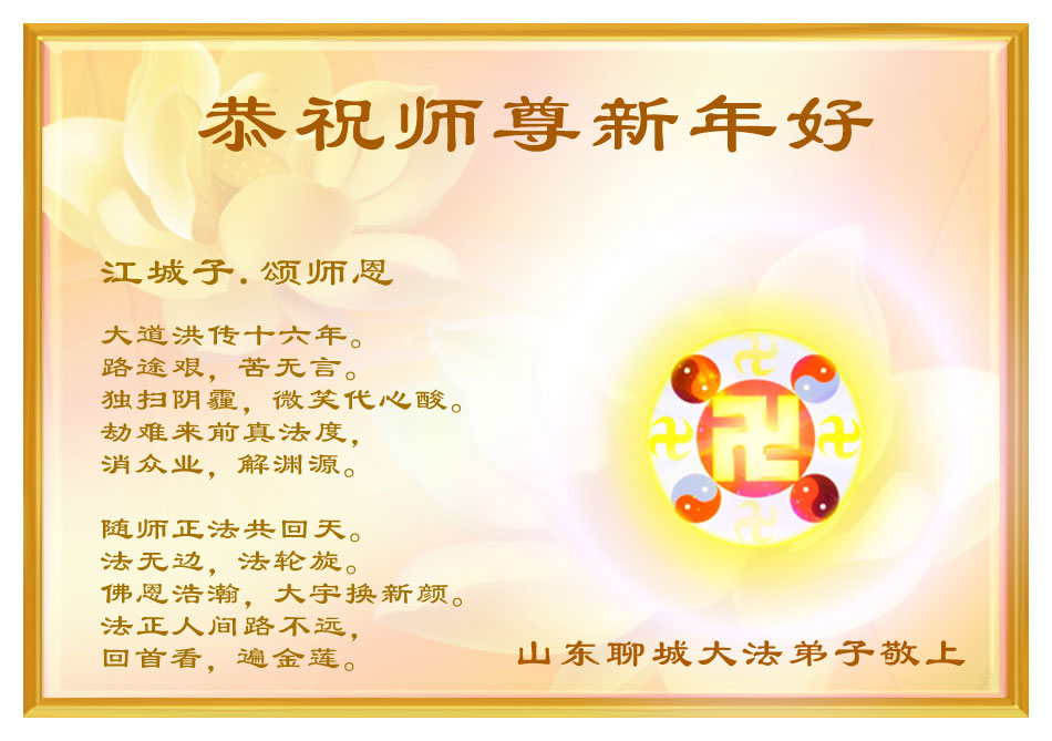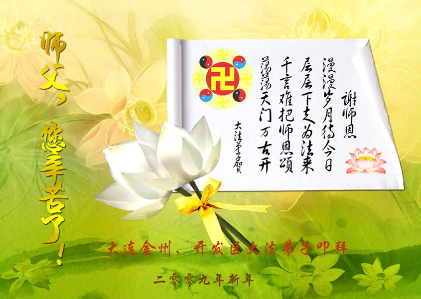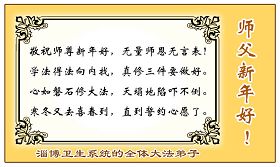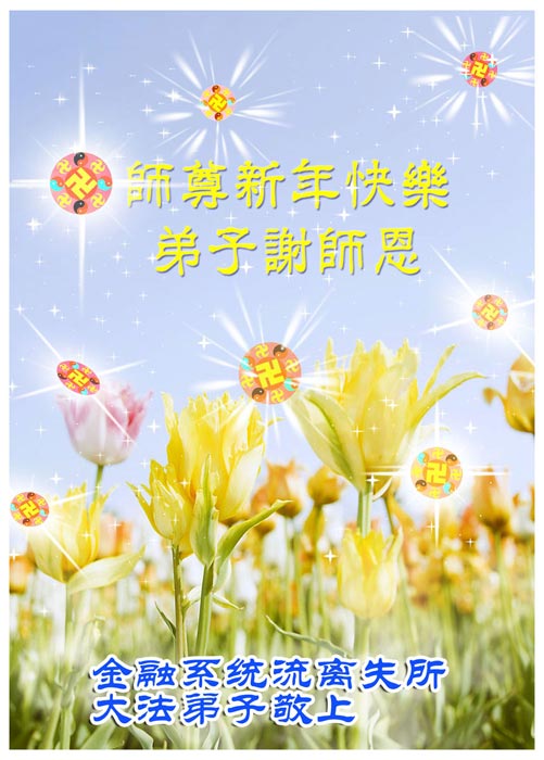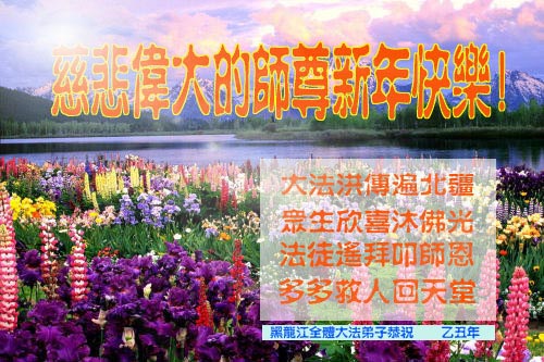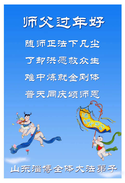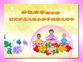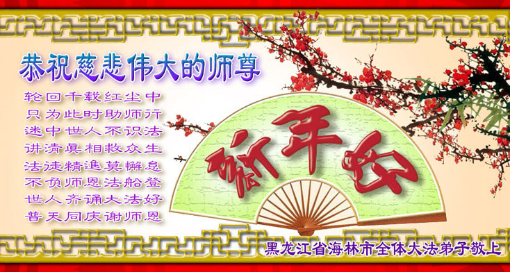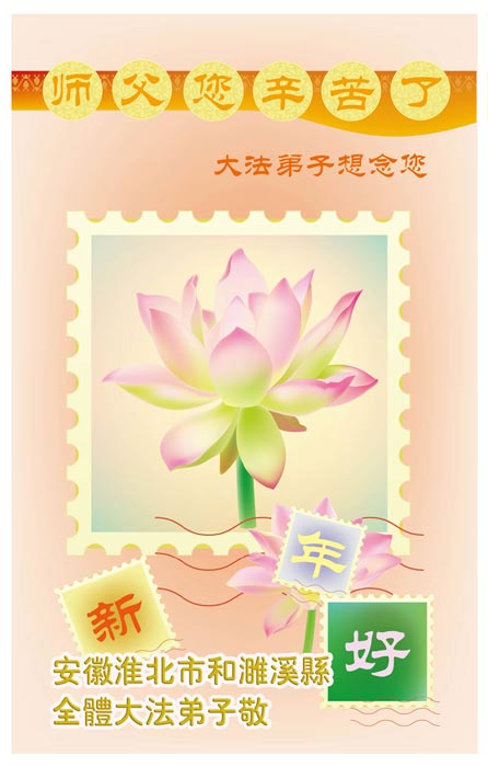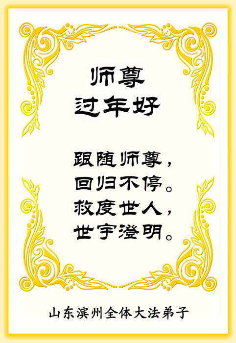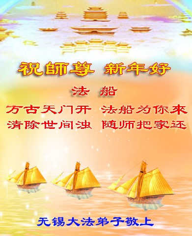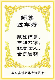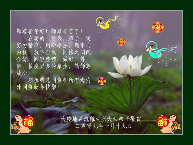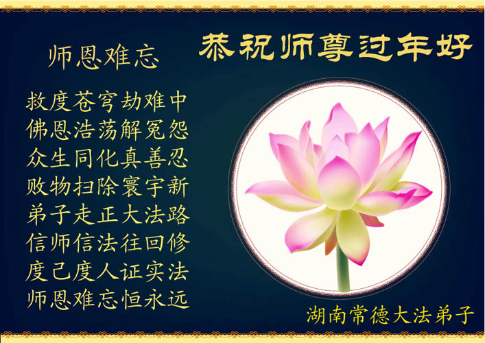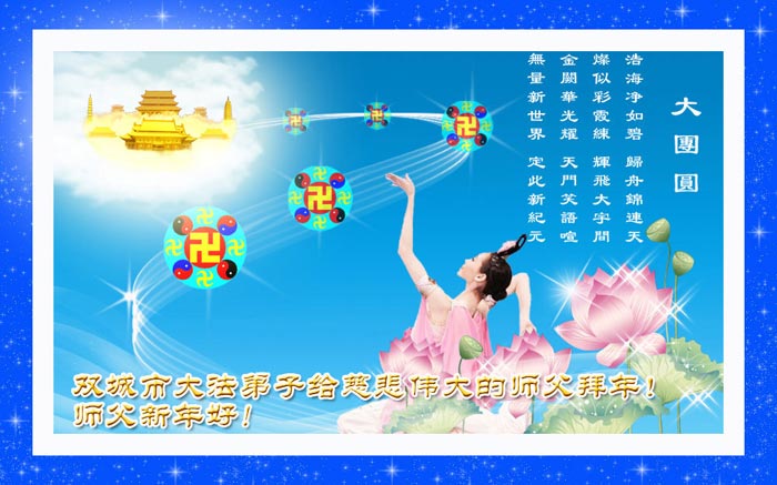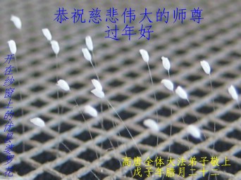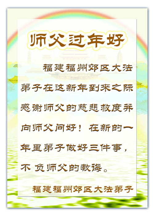 在中国新年到来之时,我们怀着无比崇敬至尊至高的心情衷心祝福师父中国新年快乐!弟子们想念师父,多想与师父同在,返本归真,回到我们真正的家园。为此只有加倍努力做好三件事,无条件的向内找,修去为私为我的旧宇宙观念,去掉最后根本的执着。讲清真相、救度众生,正念正行,完成正法时期大法弟子的伟大使命!