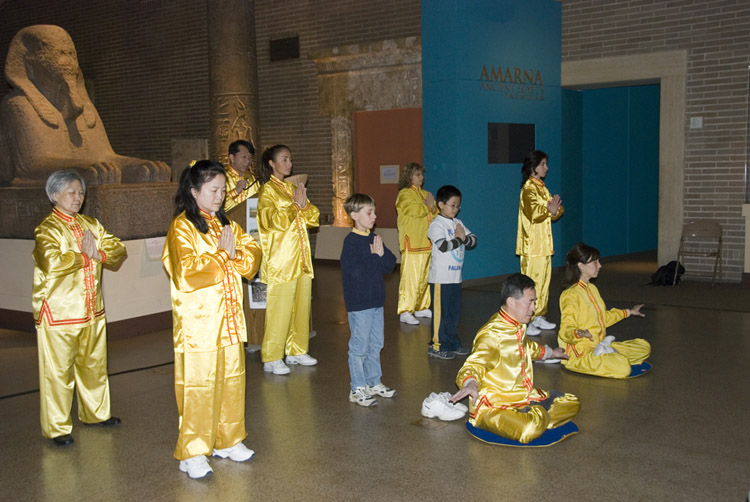十一年前,法轮功学员第一次将法轮大法带到了宾大博物馆,就是在这个活动中很多有缘人得法了,其中包括今天正在作功法演示——打坐的泰瑞。当时正得了莱姆病(Lyme)晚期的泰瑞,她的每块骨头、每根肌肉纤维都疼痛着,半个身体没有知觉。在那次活动中,她的一个中国朋友听到了法轮功,并带给她《转法轮》这本书。 从此她获得了新生,不但疾病无影无踪,更重要的是知道了生命的价值。
