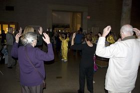 法轮功展位前吸引了很多有缘人前来咨询,有的游客当场就跟着旁边教功录像带演示的功法炼了起来。法轮功学员于中午十二点多在Lower Egyptian Gallery做功法演示,吸引了很多人前来观看,不少人当场跟着炼了起来。学完后,一位女士说:“舒服极了!我还要炼。”