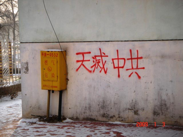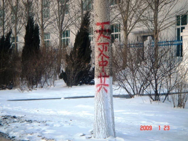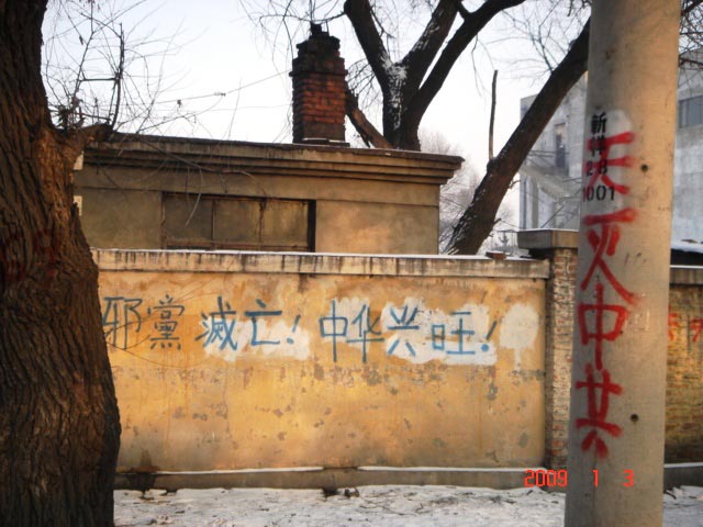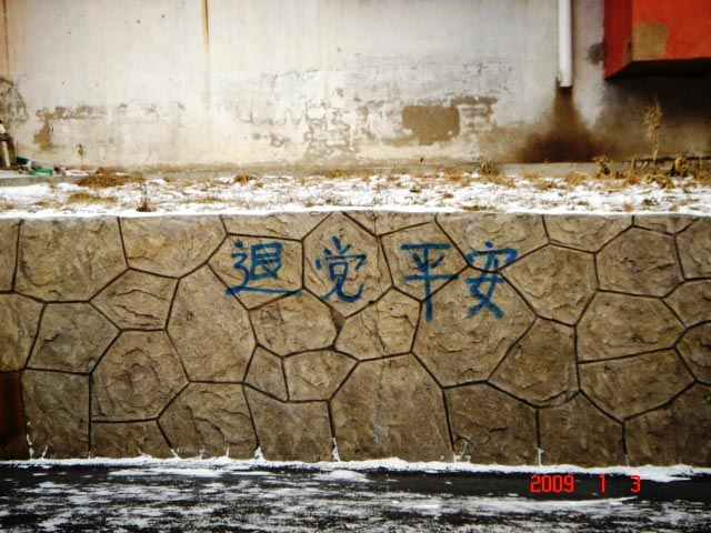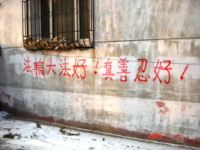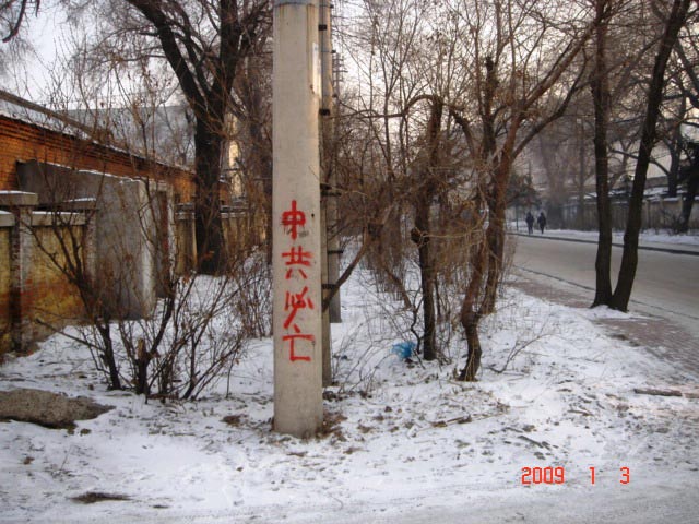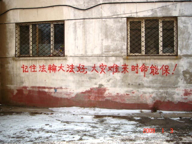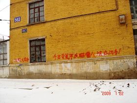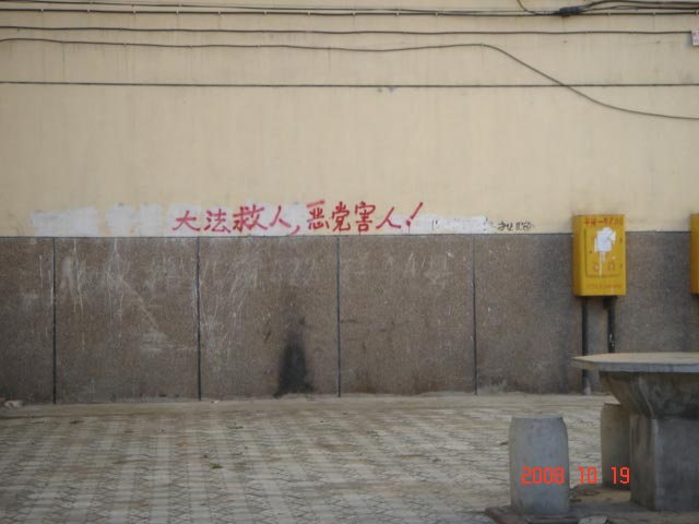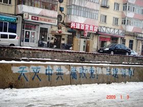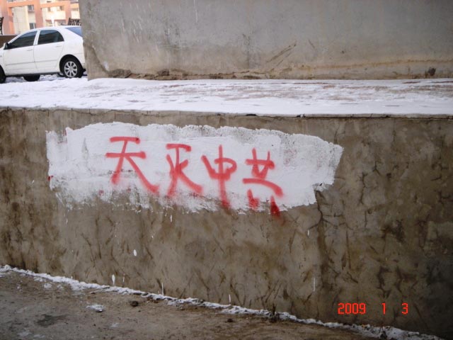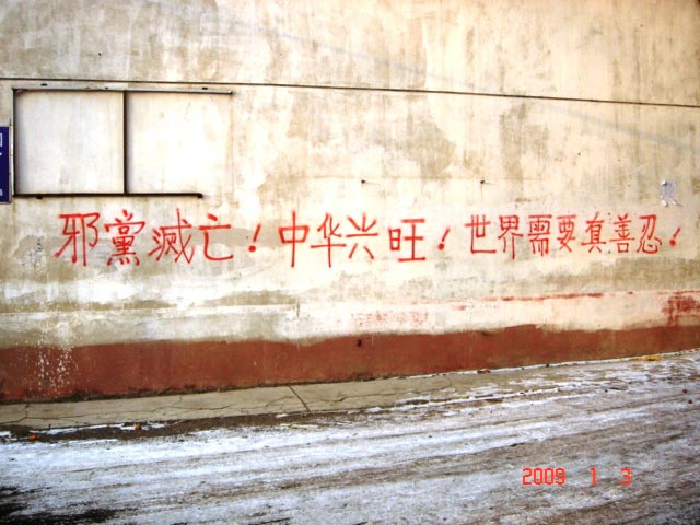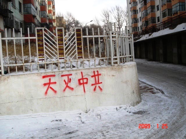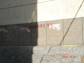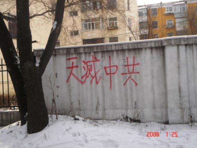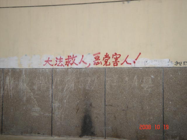 “天灭中共”、“退党保命”、“声援四千八百万人退党”、“中央党校25名高官集体退党”、“法轮大法好”、“信仰无罪,停止迫害”、“平反法轮功,法办江泽民”、“法轮功被迫害千古奇冤”、“欢迎法轮功,法办江泽民”、“大法救人,恶党害人”、“天灭腐败党”、“中共是万毒之源”等;