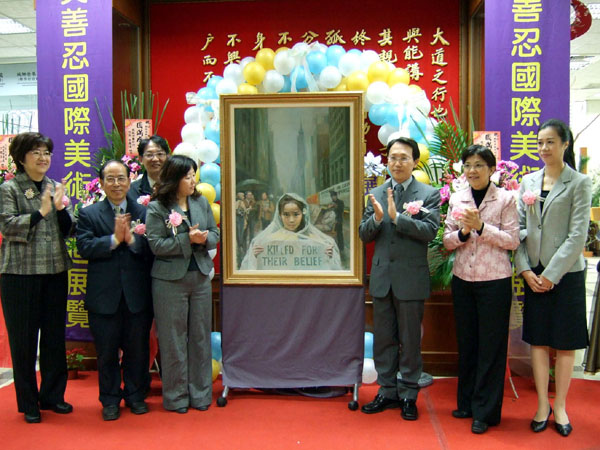 ![]() 真善忍国际美术巡回展览,一月五日在桃园县政府大厅揭幕,图左至右为桃园县政府社会处处长张锦丽、桃园县议员林丕章、行政处处长邱明俊、县议员邱素芬、刘俊义、新三才文化协会理事长张锦华、县议员万美玲。 |