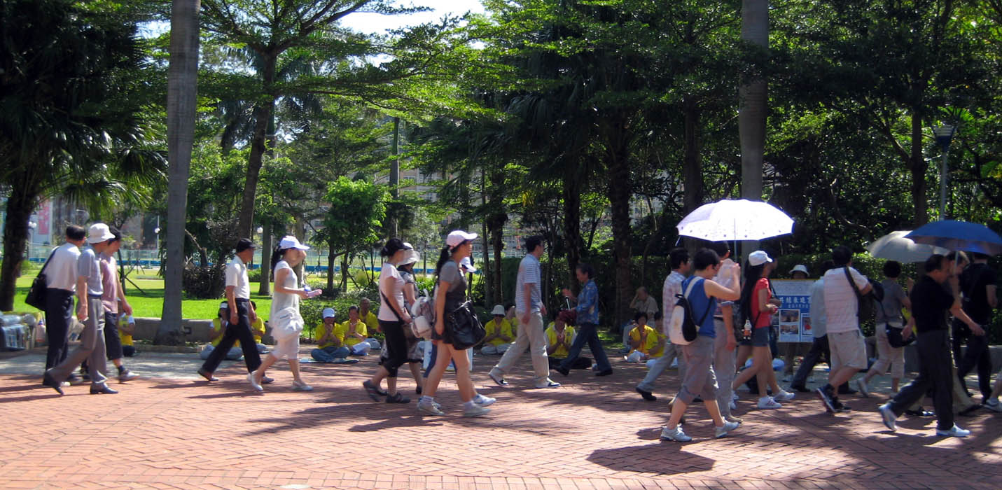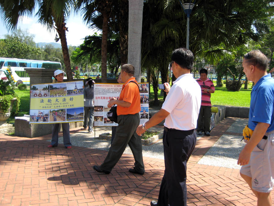来来去去的观光客为殊胜的炼功场景所吸引和触动,不时有人拿起照相机拍摄,有人舍弃园内景色,跑到大门外边矮墙,细细翻阅法轮功简介、《九评共产党》等真相材料,或观看DVD播放的法轮功真相光碟影片。一位先生在真相展板前停留甚久,仔细观看法轮大法洪传全世界的简介与各地学员炼功照片,中共无理迫害以及残酷虐杀法轮功学员的真相报导。他在角落处坐下来,要求学员告诉他更多真相。