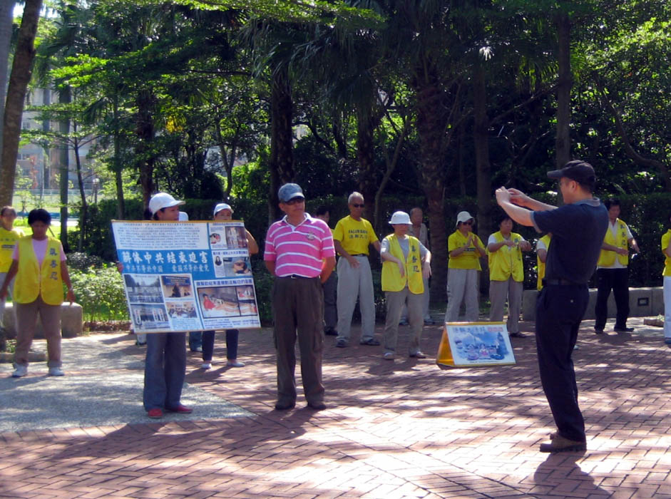 从二零零五年开始,起初只有二、三位学员在官邸正房附近炼功,大陆观光客日多的讯息传开后,有方便条件的同修陆续加入,到现在移至大门右侧的位置,每天至少十几、二十位,假日时则是三十几位不等。