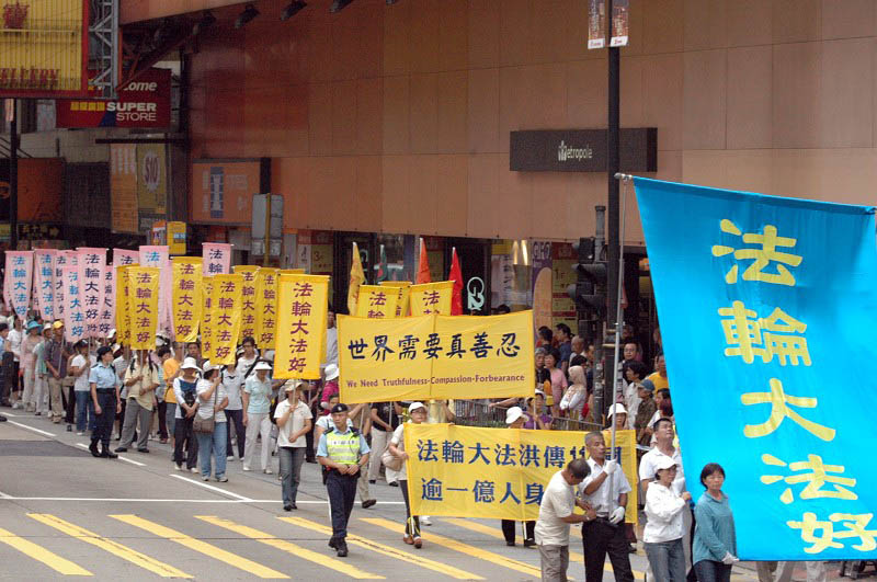 ![]() 二零零九年十月一日,香港举行声援六千一百万勇士退出中共大游行,“法轮大法好”旗帜在居住了大批大陆新移民的香港北角街道上飘扬。 |