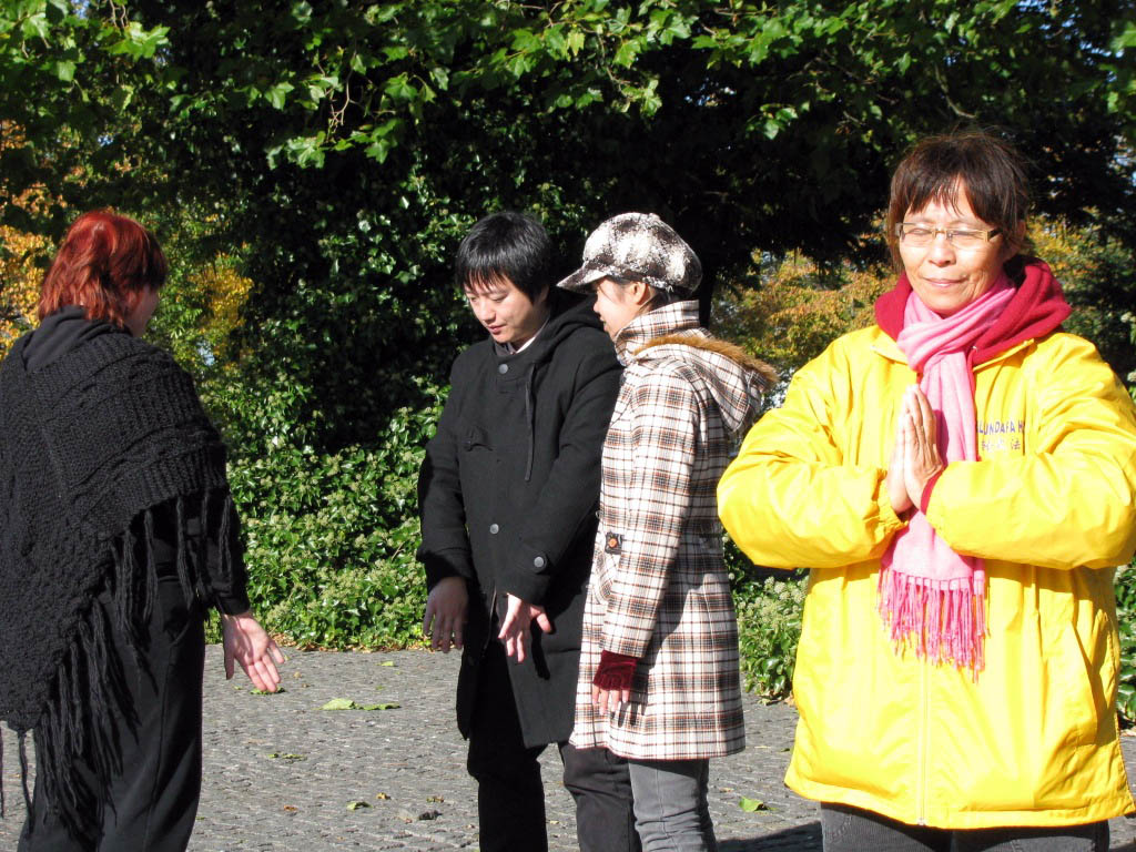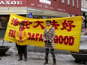 有一位在报社工作丹麦人接过法轮功的真相资料后说,可以把你们炼功的情景拍下来吗?得到认可后,他拍了不少照片。学员詹妮(Jannie)告诉他:法轮大法(又称法轮功)是中国古老的修炼方法,以“真、善、忍”为准则,向他介绍法轮功在全世界的洪传盛况,并揭露中共对法轮功长达十年的残酷迫害。他离开时说:“祝你们好运,希望你们尽量把你们的同修能够救出来。”