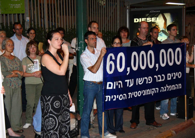 十月一日,以色列法轮功学员在中领馆前举行了声援六千万中国人退出中共恶党、团、队组织的集会活动。活动中,学员们打着:“中共暴政、天理不容”,“中共不等于中国”,“退党自救”,“天灭中共、天佑中华”,“停止迫害”等横幅。在集会上发言的学员表示,希望更多的民众认清中共的邪恶本质,尽快加入“三退”(退出中共恶党、团、队组织)大潮。