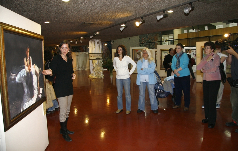 ![]() “真善忍国际美展”二零零八年三月在以色列特拉维夫大学展出,解说人员向参观画展的观众介绍画作的背景。 |