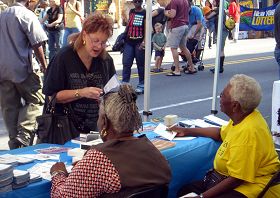 二零零九十月四日,秋高气爽、阳光灿烂。法轮功学员参加了纽约布碌伦区一年一度最大集市。许多人前来了解法轮功的讯息,他们有的表