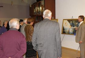 “真善忍国际美展”先从以“修炼的美好”为主题的一组油画开始。讲解员沃尔克•迪茨向观众解释了什么叫做“修行”,这个在西方社会属于陌生的术语,在中国却有着悠久的传统,它的涵义涉及到自我境界的提升及完善。沃尔克•迪茨把“修炼”两字用汉语的发音念了一遍,并解释,“修”直译是“修复”或“修补”的意思,“炼”则意味着“冶炼”或“提炼”。“修炼”有许多有宗教形式的和无宗教形式的方式和法门,法轮大法把修行方法的精华用“真善忍”三个字都概括进去了。