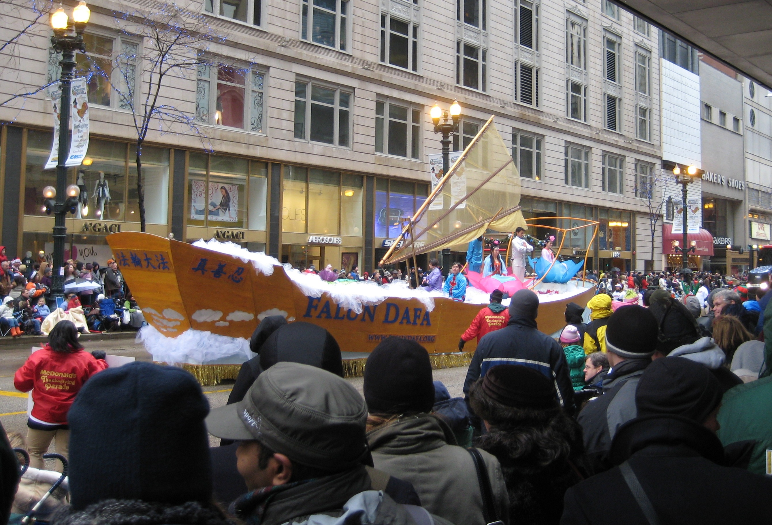 芝加哥“麦当劳”感恩节游行与纽约市的“梅西”感恩节游行是美国仅有的两个通过电视全程直播到百万家庭的感恩节游行,广受各界关注。当天早上,芝加哥政府大道上人山人海,观众们兴致勃勃地欣赏着精彩纷呈的队伍。法轮大法团体的“法船”驶来,在浮云的衬托下,七彩莲花上法轮功学员祥和的功法演示赢得观众们的热烈喝彩。