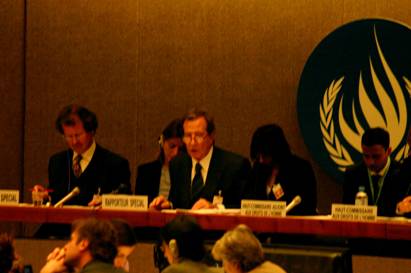 ![]() 联合国“法官和律师的独立性” 特派专员莱安德罗•德斯波伊(左二)在2005年的日内瓦人权会议上做报告。法轮功学员代表列席此次会议并会晤了相关特派专员。 |