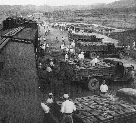 ![]() 图一:韩战期间在苏家屯用卡车供应物资的景象 |