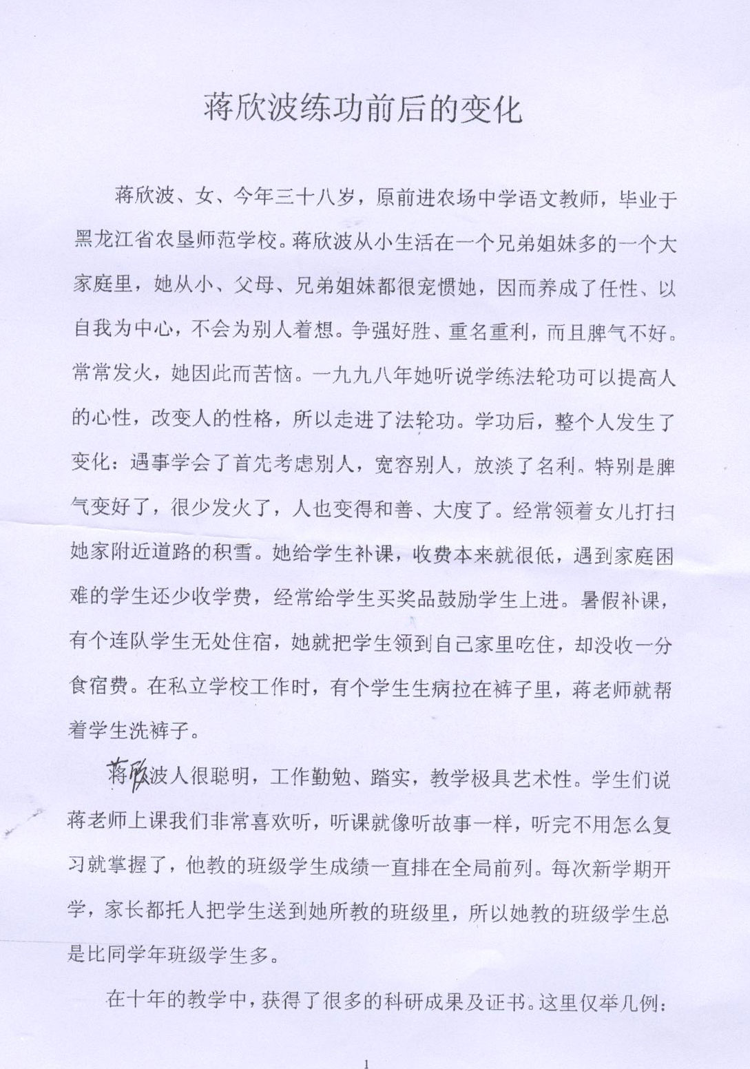 蒋欣波的丈夫为营救妻子写了一封呼吁征签信,真实讲述了蒋欣波炼功前后的变化,蒋欣波原所在工作单位——前进中学与其一起共事的教师非常同情他们一家的遭遇(蒋欣波夫妇原在同一所学校供职),共有四十多人在呼吁征签信上签上了自己的名字。