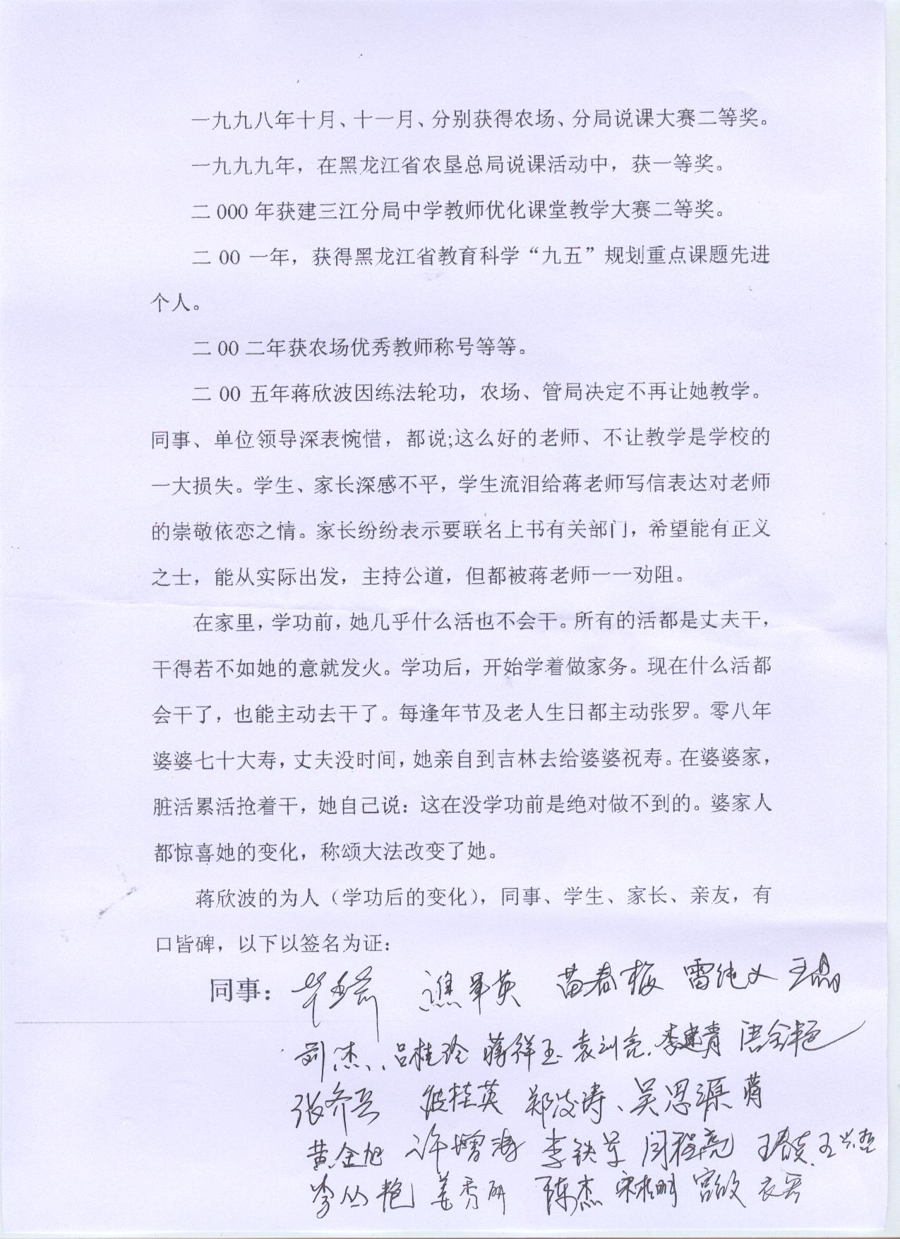 蒋欣波的丈夫为营救妻子,写了一封呼吁征签信,真实讲述了蒋欣波炼功前后的变化,蒋欣波原所在工作单位——前进中学与其一起共事的教师非常同情他们一家的遭遇(蒋欣波夫妇原在同一所学校供职),共有四十多人在呼吁征签信上签上了自己的名字。十一月二日,前进中学校长王玉海将四十多名签名的教师召集到一起大骂,逼迫他们写检查。