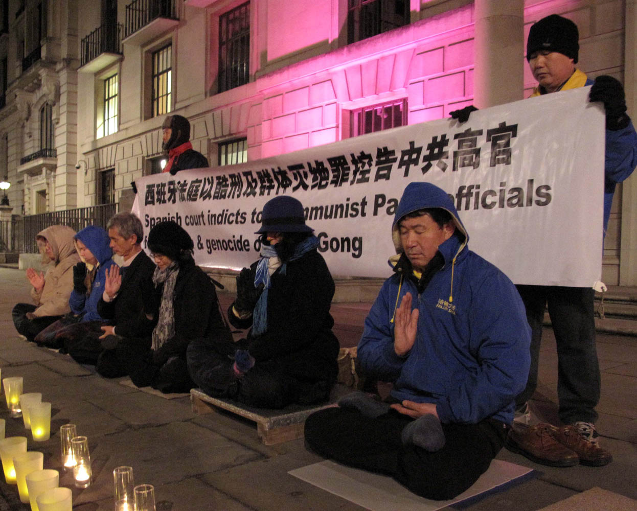 自中共迫害法轮功以后,几年来,英国法轮功学员每逢世界人权日,都在伦敦中使馆前举行反迫害活动。今年,针对西班牙国家法庭近日决定以群体灭绝罪及酷刑罪,起诉包括中共前党魁江泽民,及罗干、薄熙来、贾庆林和吴官正,五名迫害法轮功元凶。法轮功学员打出了一个新的横幅:“西班牙法庭以酷刑罪和群体灭绝罪控告中共高官”,以警醒世人关注这一涉及全人类道德良知的正义审判。