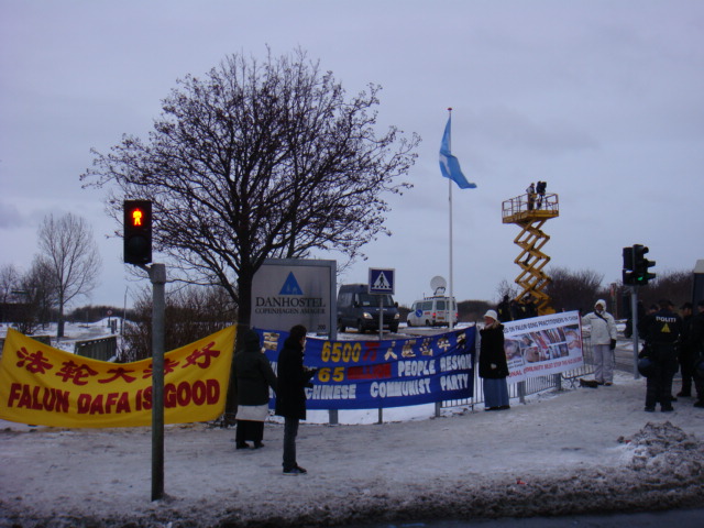 法轮功学员在贝拉会议中心外拉开“法轮大法好”横幅,写着“辽宁公安曝光曾在中共辽宁军区总医院目击军医活摘法轮功学员心脏肾脏全过程”、“西班牙国家法庭近日以酷刑罪和群体灭绝罪起诉江泽民、罗干、薄熙来、贾庆林、吴官正”等的展板,并展示中共酷刑迫害法轮功修炼者的证据。学员们冒着零下四、五度的严寒,在寒风中平和地演炼功法,来往的汽车中时常有人鸣笛致意。