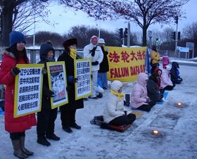![]() 严寒中,法轮功学员呼吁人们关注发生在中国的迫害。 |