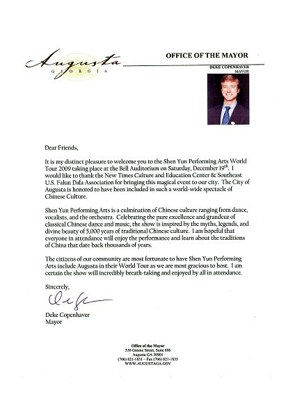 为欢迎神韵来到奥古斯塔市,该市市长德柯•卡朋汉弗(Deke Copenhaver)日前特地给主办方发出贺信,对神韵艺术团能莅临该市威廉•贝尔会堂(William B. Bell Auditorium)演出表达至诚的欢迎并引以为荣。