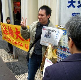 澳门法轮功学员打出“法轮大法好”,“法轮大法、真善忍”及“解体中共 停止迫害”等横幅。“玫瑰堂前地”大陆游客众多,当学员摆放横幅时,已有大批大陆游客围观,当横幅及真相图片打开后,游客纷纷取出照相机拍照,及主动向学员取阅真相资料。