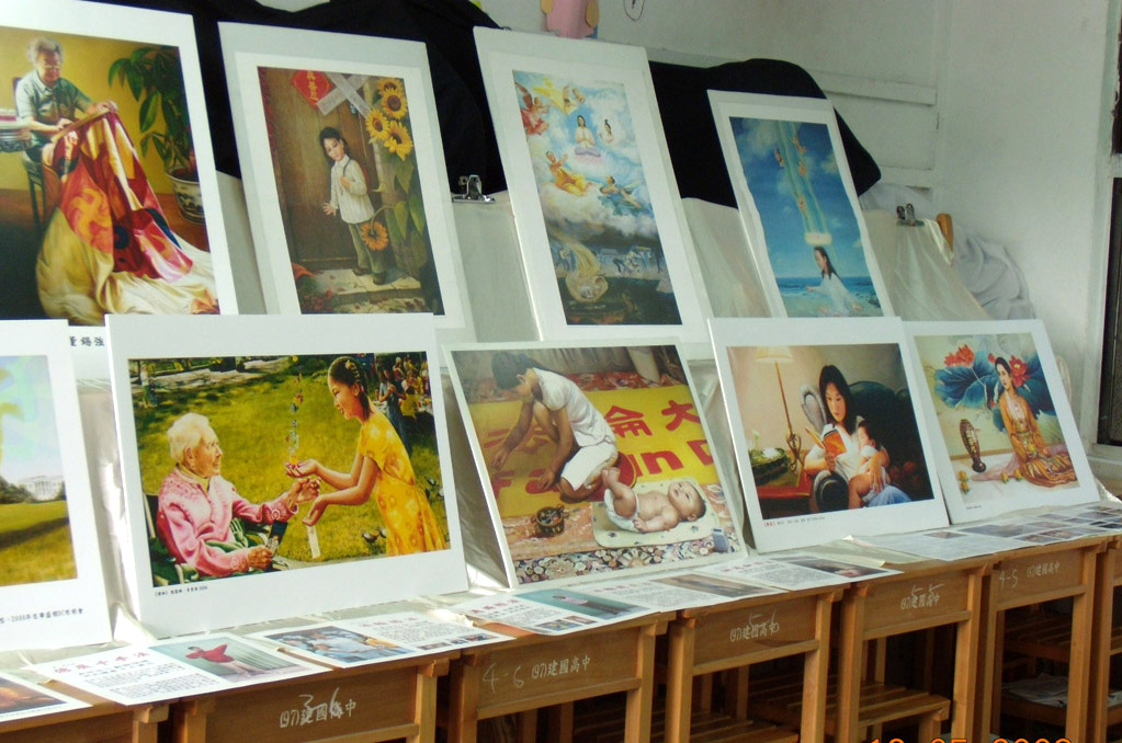 ![]() 建中校庆中的法轮功社团展出的真善忍美展画作 |