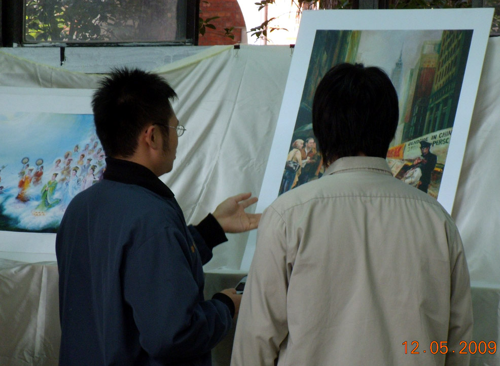 同学们与老师们发现这里有一幅幅精美的画作,便好奇地走了进来。他们注意到这些画作有着更深的内涵,才知道是修炼法轮功的艺术家们所画的。有些人不知道法轮功,也有些人约略听过或是在外头看见,但是在这一次美的飨宴中又更加清楚法轮功究竟是什么样的功法,为什么无辜被中共迫害。