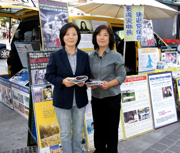 ![]() 在韩国首尔明洞购物区长年坚持讲真相的徐女士(左)和河女士(右) |