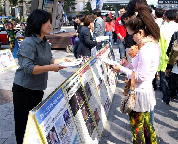 徐女士说:“以前我们找过国会、外交通商部、媒体,向他们反映中共迫害法轮功的真相,可是他们一直在回避。红十字会的工作人员说,韩国器官移植的患者中,百分之八十的人去了中国接受器官移植手术。我们找到了执政党和在野党的一些国会议员,告诉他们关于中共活体摘取法轮功学员器官贩卖牟利的事实,我们问他们怎么能对中共这种杀人暴行保持沉默呢?有位年轻的国会议员非常关注此事,表示要了解相关的信息。也有的国会议员表示沉默。”