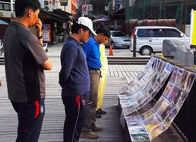 ![]() 许多游客观看揭露迫害真相的看板 |
