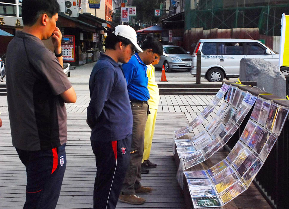 法轮功学员分散在码头各角落,向路过游客说明迫害真相,也有学员开着车,挂上揭露中共刑虐法轮功学员的看板,慢速穿梭商店街。一位过去做媒体的市民在真相图片前告诉法轮功学员说:“你们这样做是对的。大陆媒体被中共封锁,民众没法了解你们被迫害的情况。”他还感慨地说:“中共是没有人性,也没有法律,我有朋友去大陆做生意,被课税课得又跑回来了。”