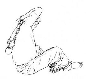 ![]() 马三家劳动教养院部份酷刑演示:绑腿加背铐 |