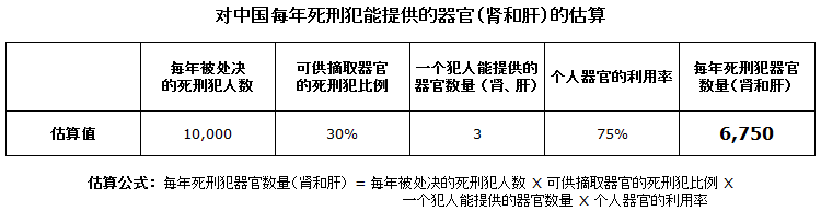 我们在这里的计算中,设定每年被处决的死刑犯人数为10,000人,可供摘取器官的死刑犯比例为30%, 一个犯人能提供的器官数量(肾和肝)是3个,3个器官能同时都被利用的比率设定为75%。为了更有说服力,我们尽量采取变量可能范围内的上限数值,计算出来的每年死刑犯器官数量应该有所高估。计算结果如下图所示。
