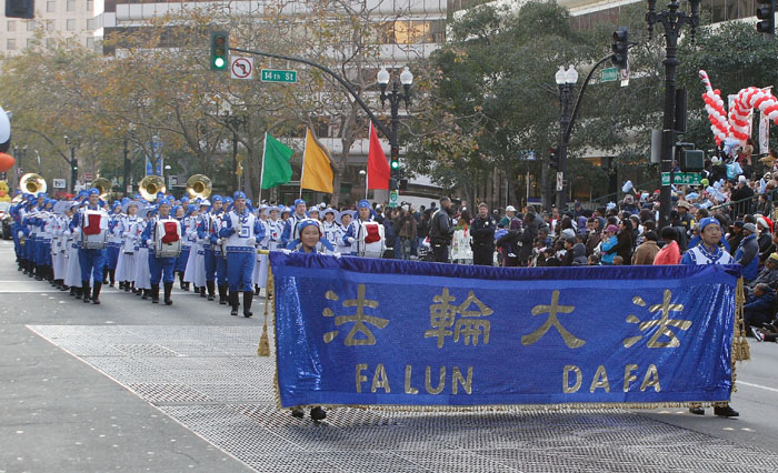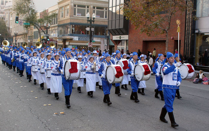 法轮功美西天国乐团应邀参加了假日大游行。身着中国古装汉服的天国乐团受到观众的欢迎。