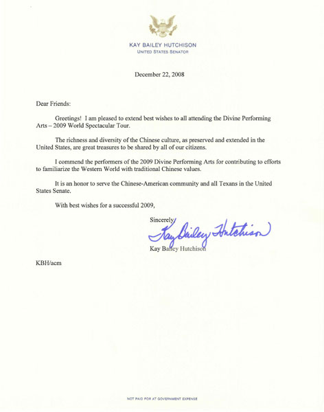 美国参议员凯·贝莉·哈切森(Sen. Kay Bailey Hutchison)二零零八年十二月就给神韵晚会主办者发来贺信。她在贺信中对所有观看神韵艺术团二零零九年巡回演出的人们表示欢迎;她认为将丰富多彩的中国文化带来与所有人们分享是非常值得珍惜的;她赞赏神韵艺术团的艺术家为将中国传统的价值观带到西方世界所付出的努力,并希望神韵艺术团二零零九年的巡演取得成功。