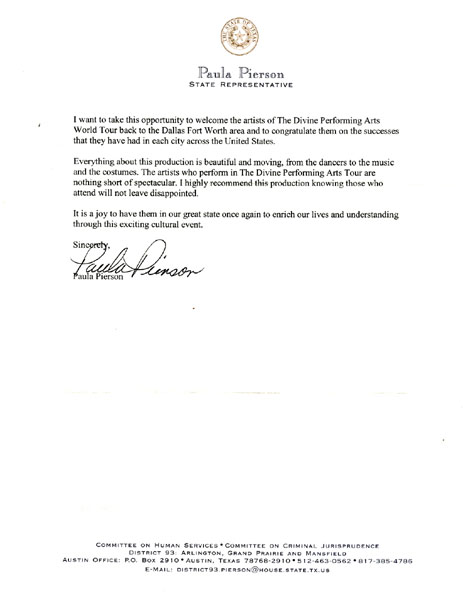 二零零八年曾观看过神韵演出的德州第九十三区众议员波拉·皮尔森(Texas State Representative Paula Pierson),被神韵精美绝伦的演出所吸引和震撼。一月十九日,皮尔森议员向主办者发来贺信,热烈欢迎神韵再次光临达福地区,并向所有人高度推荐神韵的演出。