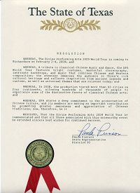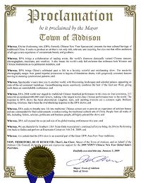 我艾德森(Addison)市长,Joe Chow,代表艾德森市长委员会荣幸的表示对二零零九年神韵在达拉斯巡演的支持。