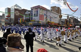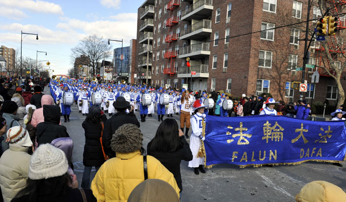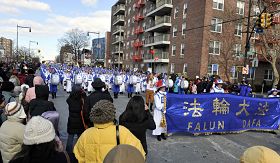 冬日的低温并没有减弱观众的热情,成百上千的观众挤在道路两边观看游行。人们翘首以盼,多姿多彩的法轮功队伍没有让观众失望。