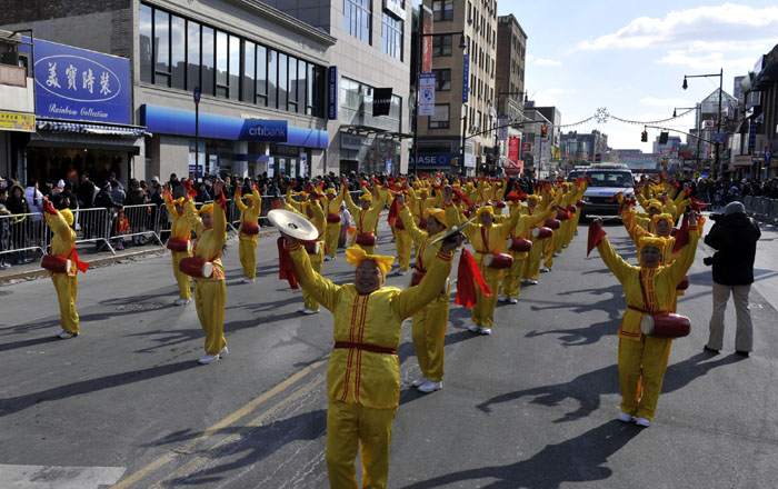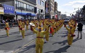 压阵的腰鼓队,头扎黄巾,身穿亮丽的金色炼功服,鼓槌灵巧的上下飞舞。和走在前面的天国乐团遥相呼应,腰鼓队的曲目也是“法轮大法好”。