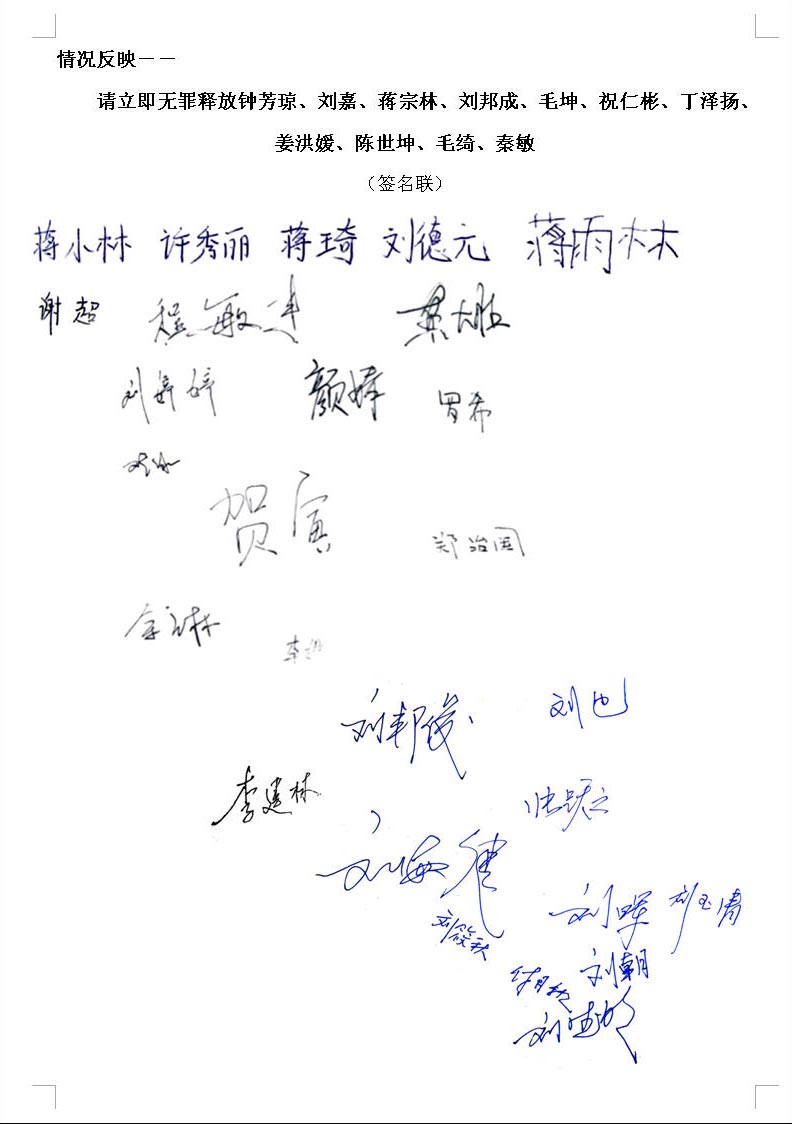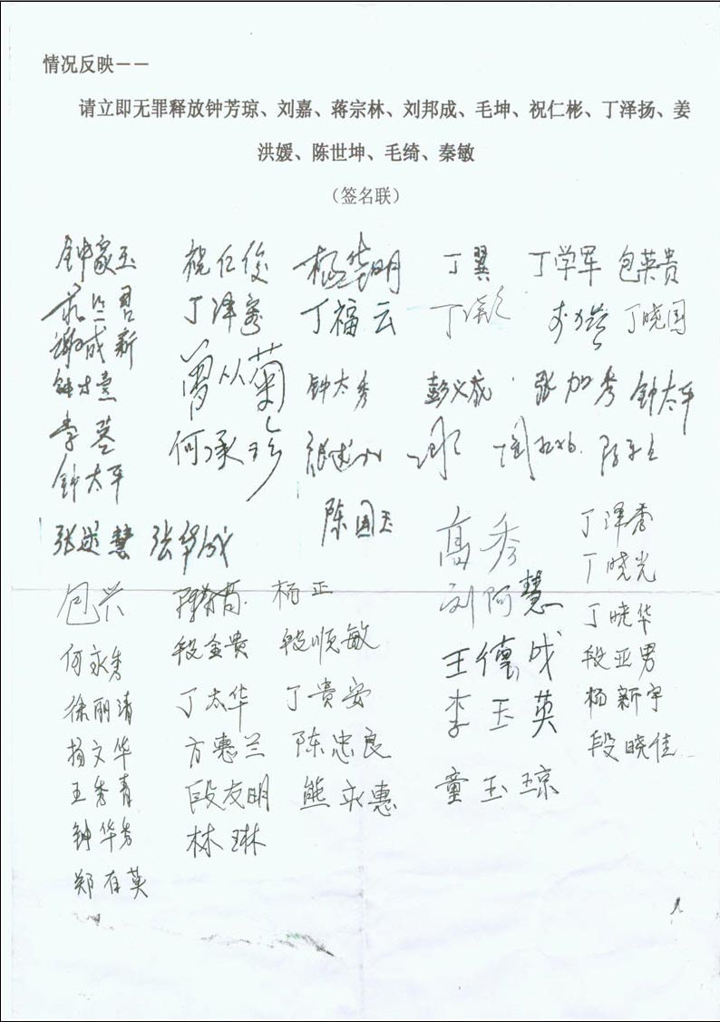 我们是钟芳琼等十一人案的各位当事人的家属。我们听说他们十一人的上诉案中院已经立案,但法官似乎并不打算开庭,并急于让律师交辩护词,对此,我们感到不解和担心,这关涉十一人重大利益的二审,为何不公开?为何要急于草草结案?不知主审法官及合议庭人员是否知道,对他们十一人的一审,程序严重违法!