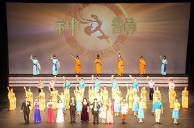 ![]() 演出结束后,神韵纽约艺术团演员向观众谢幕 |