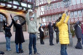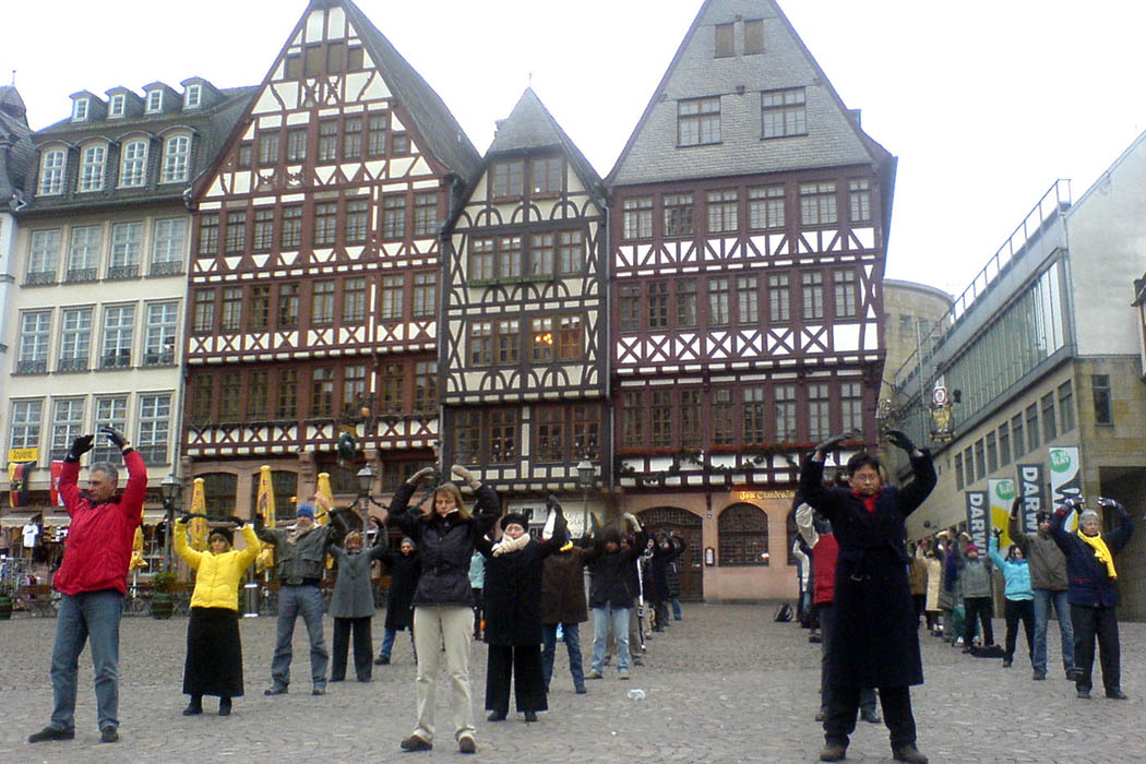 ![]() 在法兰克福市中心的传统民居前,中西方法轮功学员于一月三十日上午集体炼功,展示中国古老的修炼法门——法轮大法。 |