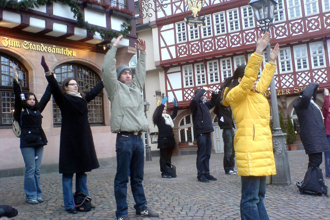 一月三十日上午,来自全德国十几个城市的四十多名法轮功学员在法兰克福的罗马广场上举行集体炼功,向西方民众展示祥和的功法和炼功者纯真纯善、坚忍不屈的精神风貌。不少路人观看询问、拍照留念,其中也有新年出国旅游的中国同胞。